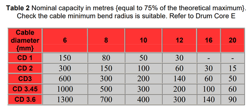 Cable drum, black powder coated Steel, suitable for long runs of multicore. Axle bearings Brake Removable handle The following chart shows the leng...